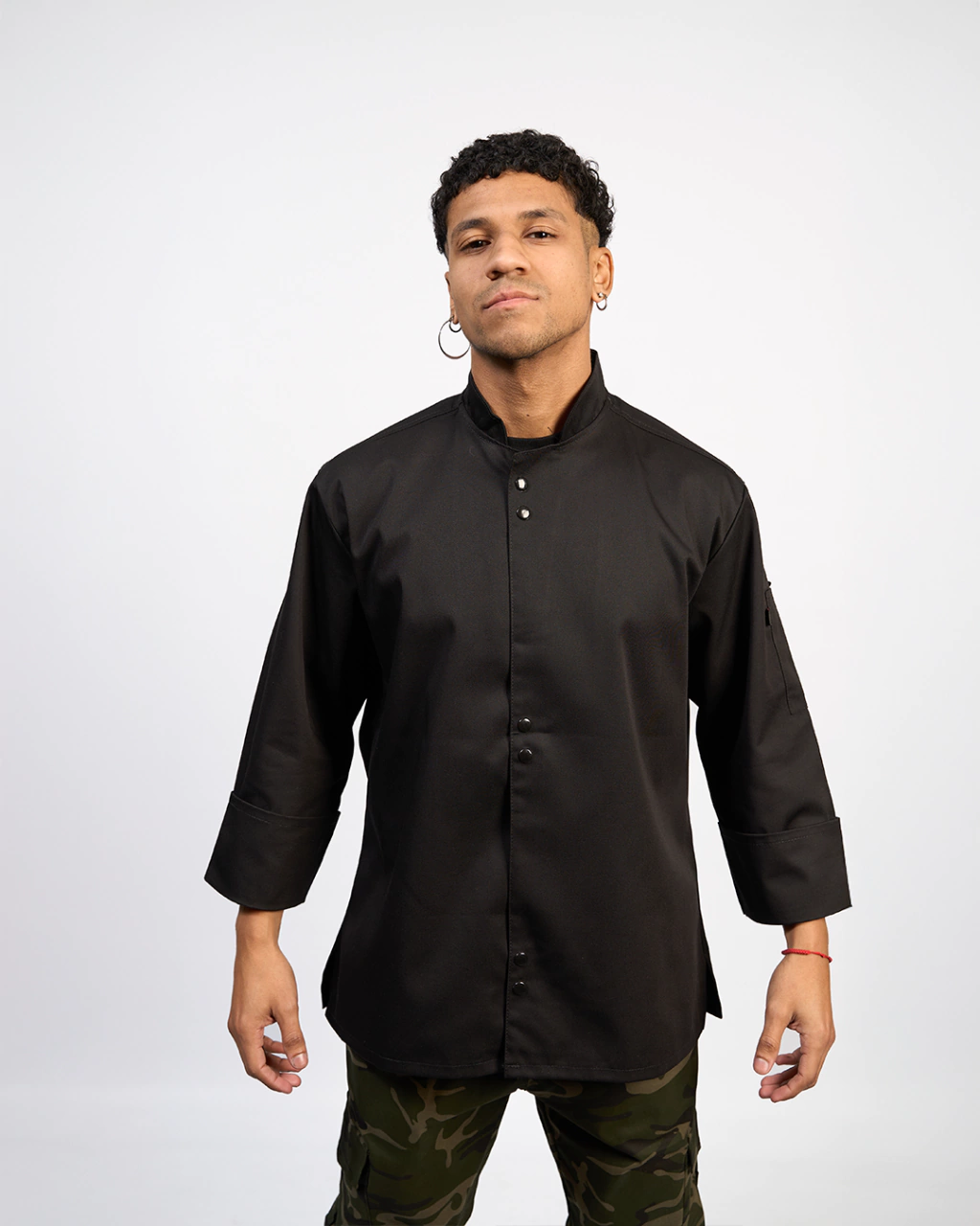 La Ugo está pensada para quienes necesitan un uniforme prolijo, cómodo y versátil. Su gabardina liviana de 6 oz aporta frescura y resistencia; el cuello mao y las mangas 3/4 con puño le dan un look actual sin perder funcionalidad.